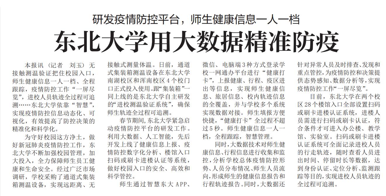 本报讯(记者 刘玉)无接触测温验证把住校园入口,师生健康信息一人一档、全程跟踪,疫情防控工作“一屏尽览”,进校人员轨迹全过程可追溯……东北大学依靠“智慧”,实现疫情防控信息动态化、可视化,有效提高了防控决策的精准化和科学化。