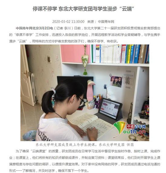 中国青年网北京3月2日电(记者 李川)日前,东北大学第二十一届研支团积极贯彻落实教育部提出的“停课不停学”工作安排,迅速投入各自的教学岗位,开展远程教学活动和学业答疑辅导,与学生携手漫步“云端”,用特殊的方式守护着支教地的孩子们,确保不停学、有收获。