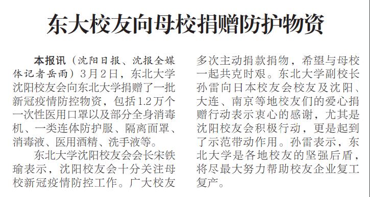 本报讯(沈阳日报、沈报全媒体记者岳雨)3月2日,东北大学沈阳校友会向东北大学捐赠了一批新冠疫情防控物资,包括1.2万个一次性医用口罩以及部分全身消毒机、一类连体防护服、隔离面罩、消毒液、医用酒精、洗手液等。