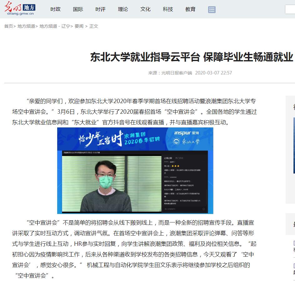 “亲爱的同学们,欢迎参加东北大学2020年春季学期首场在线招聘活动暨浪潮集团东北大学专场空中宣讲会。”3月6日,东北大学举行了2020届春招首场“空中宣讲会”。全国各地的学生通过东北大学就业信息网和“东大就业”官方抖音号在线观看直播,并与直播嘉宾积极互动。