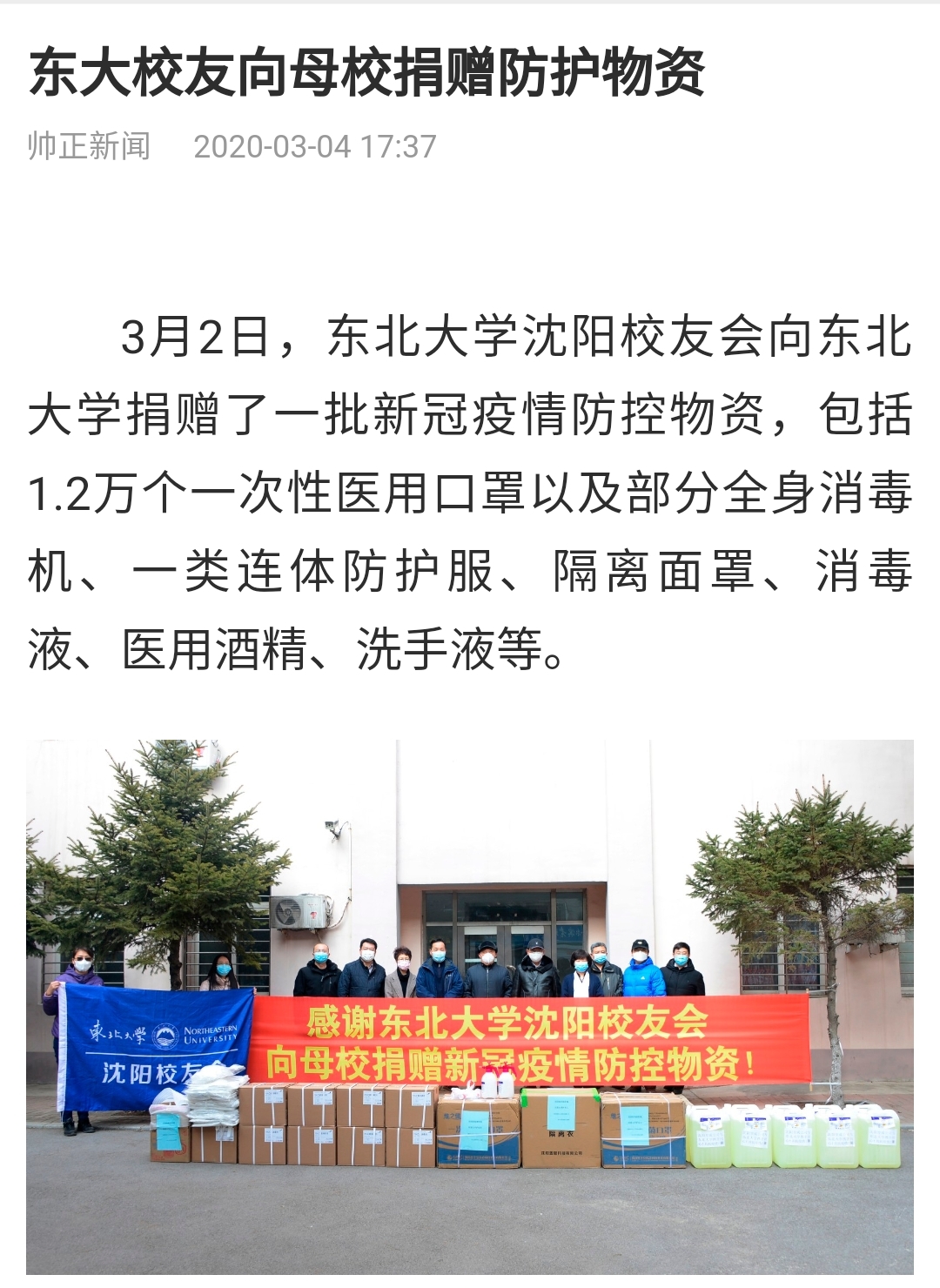 3月2日,东北大学沈阳校友会向东北大学捐赠了一批新冠疫情防控物资,包括1.2万个一次性医用口罩以及部分全身消毒机、一类连体防护服、隔离面罩、消毒液、医用酒精、洗手液等。
