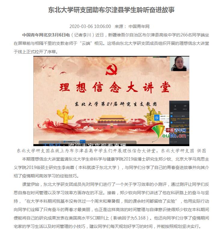 中国青年网北京3月6日电(记者李川)近日,新疆维吾尔自治区布尔津县高级中学的266名同学端坐在屏幕前与相隔千里的支教老师于“云端”相见。这场由东北大学研支团成员组织开展的理想信念大讲堂于线上正式拉开了序幕。