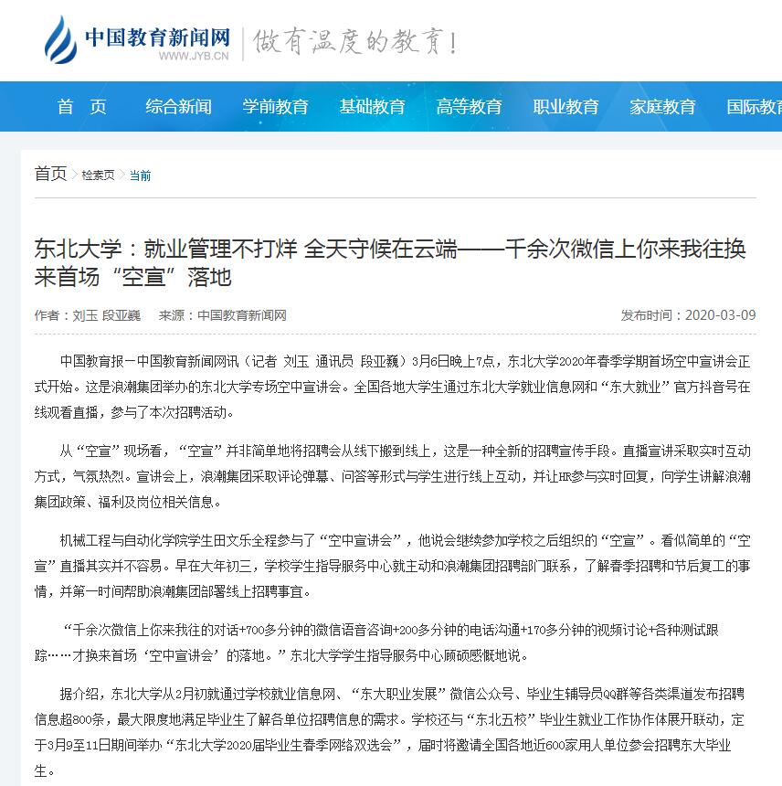 中国教育报—中国教育新闻网讯(记者 刘玉 通讯员 段亚巍)3月6日晚上7点,东北大学2020年春季学期首场空中宣讲会正式开始。这是浪潮集团举办的东北大学专场空中宣讲会。全国各地大学生通过东北大学就业信息网和“东大就业”官方抖音号在线观看直播,参与了本次招聘活动。