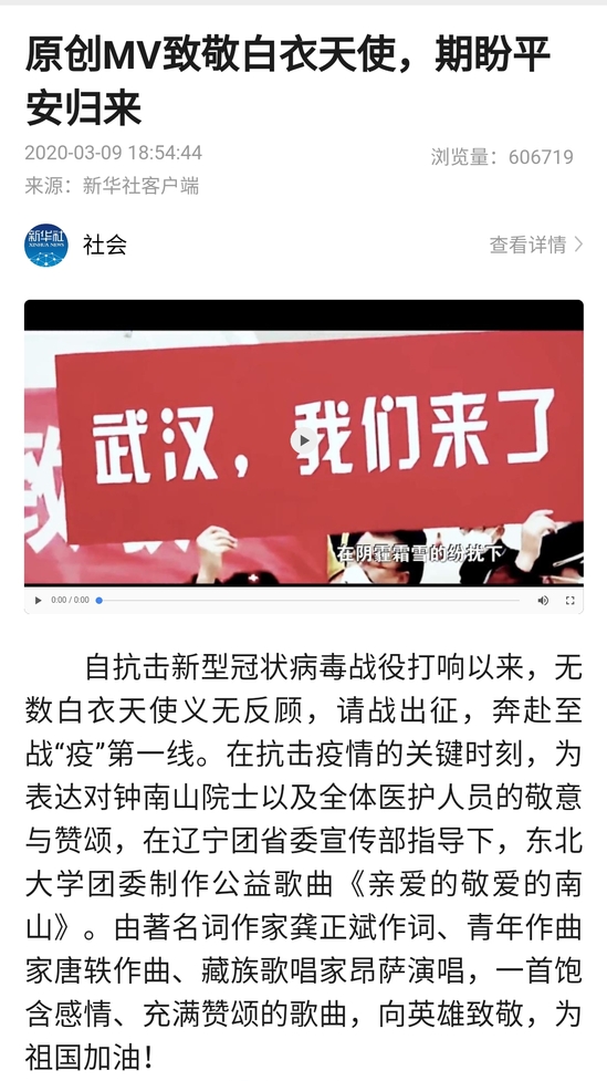 自抗击新型冠状病毒战役打响以来,无数白衣天使义无反顾,请战出征,奔赴至战“疫”第一线。在抗击疫情的关键时刻,为表达对钟南山院士以及全体医护人员的敬意与赞颂,在辽宁团省委宣传部指导下,东北大学团委制作公益歌曲《亲爱的敬爱的南山》。由著名词作家龚正斌作词、青年作曲家唐轶作曲、藏族歌唱家昂萨演唱,一首饱含感情、充满赞颂的歌曲,向英雄致敬,为祖国加油!