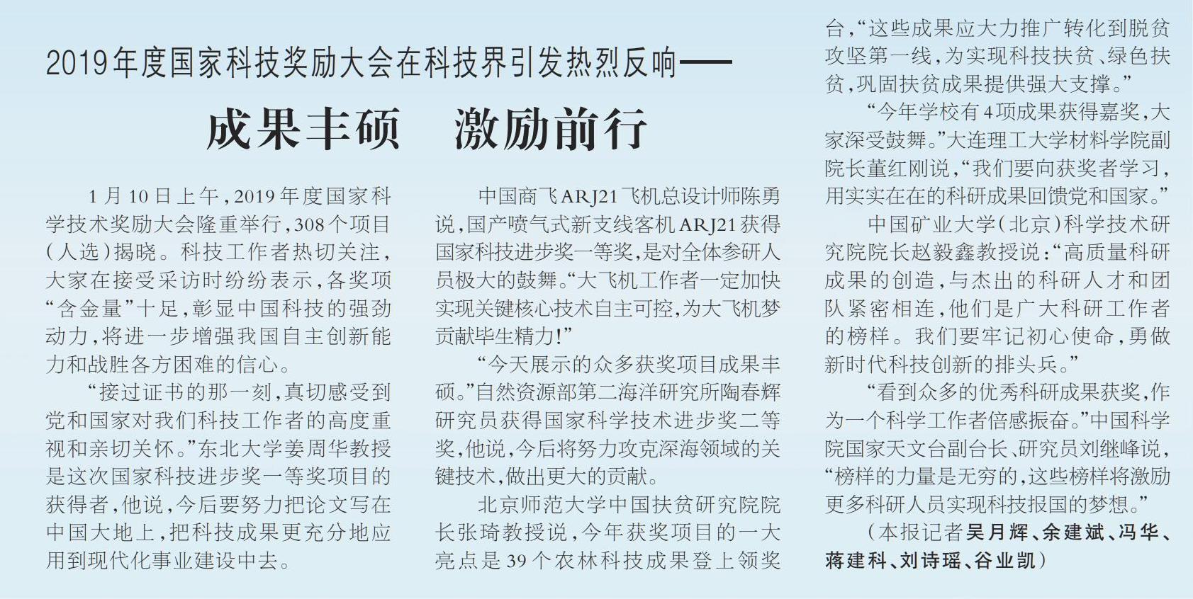1月10日上午,2019年度国家科学技术奖励大会隆重举行,308个项目(人选)揭晓。科技工作者热切关注,大家在接受采访时纷纷表示,各奖项“含金量”十足,彰显中国科技的强劲动力,将进一步增强我国自主创新能力和战胜各方困难的信心。
