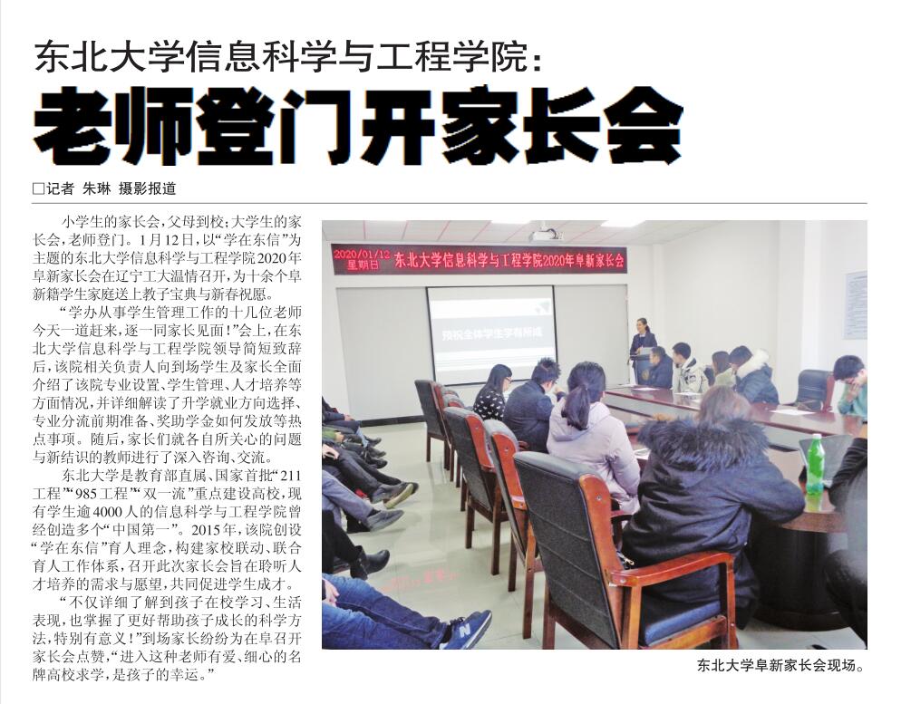 小学生的家长会,父母到校;大学生的家长会,老师登门。1月12日,以“学在东信”为主题的东北大学信息科学与工程学院2020年阜新家长会在辽宁工大温情召开,为十余个阜新籍学生家庭送上教子宝典与新春祝愿。