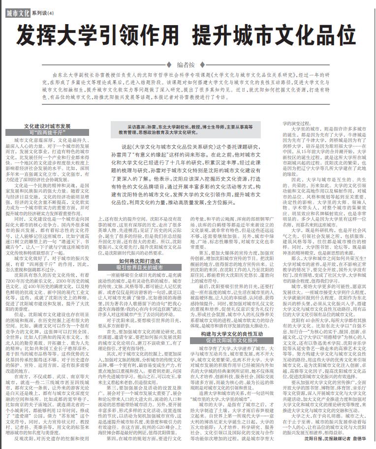 说起《大学文化与城市文化品位关系研究》这个委托课题研究,孙雷用了“有意义的缘起”这样的词来形容。在此之前,他对城市文化和大学文化已经进行了十几年的研究,积累沉淀丰厚,经过此课题的梳理与研究,孙雷对于城市文化特别是沈阳的城市文化建设有了更深入的了解。他表示,沈阳应该深入挖掘历史文化资源,打造有特色的文化品牌项目,通过开展丰富多彩的文化活动等方式,构建有沈阳特色的城市文化,发挥大学的文化引领作用,提升城市文化品位,利用文化的力量,推动高质量发展,全方位振兴。