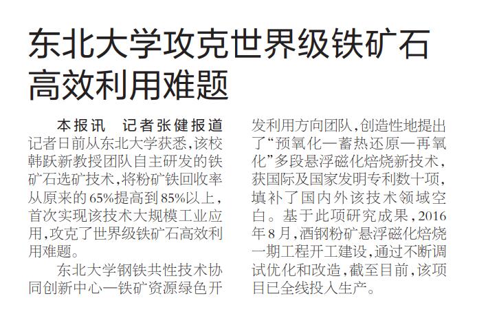 东北大学钢铁共性技术协同创新中心—铁矿资源绿色开发利用方向团队,创造性地提出了“预氧化—蓄热还原—再氧化”多段悬浮磁化焙烧新技术,获国际及国家发明专利数十项,填补了国内外该技术领域空白。基于此项研究成果,2016年8月,酒钢粉矿悬浮磁化焙烧一期工程开工建设,通过不断调试优化和改造,截至目前,该项目已全线投入生产。