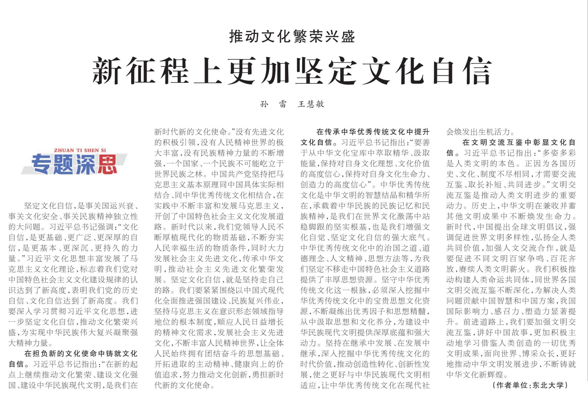 在担负新的文化使命中铸就文化自信。习近平总书记指出:“在新的起点上继续推动文化繁荣、建设文化强国、建设中华民族现代文明,是我们在新时代新的文化使命。”没有先进文化的积极引领,没有人民精神世界的极大丰富,没有民族精神力量的不断增强,一个国家、一个民族不可能屹立于世界民族之林。中国共产党坚持把马克思主义基本原理同中国具体实际相结合、同中华优秀传统文化相结合,在实践中不断丰富和发展马克思主义,开创了中国特色社会主义文化发展道路。新时代以来,我们党领导人民不断厚植现代化的物质基础,不断夯实人民幸福生活的物质条件,同时大力发展社会主义先进文化,传承中华文明,推动社会主义先进文化繁荣发展。坚定文化自信,就是坚持走自己的路。我们要紧紧围绕以中国式现代化全面推进强国建设、民族复兴伟业,坚持马克思主义在意识形态领域指导地位的根本制度,顺应人民日益增长的精神文化需求,发展社会主义先进文化,不断丰富人民精神世界,让全体人民始终拥有团结奋斗的思想基础、开拓进取的主动精神、健康向上的价值追求,努力推动文化创新,勇担新时代新的文化使命。
