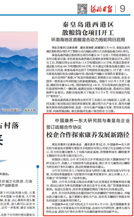 河北日报讯(记者孙也达 通讯员齐芳)近日,中国康养—东大研究院与秦皇岛市惠斯安普医学系统股份有限公司签订校企战略合作协议,双方将在建设康养人才实践与就业基地、数智康养城市、睡眠康养主题培疗机构等方面深度合作。