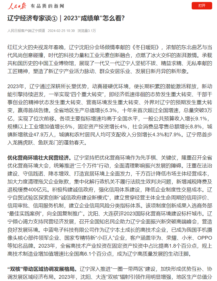 优化营商环境壮大民营经济。辽宁坚持把优化营商环境作为先手棋、关键仗,隆重召开全省优化营商环境大会,统筹推进“三个万件”行动,全面清理影响振兴发展的障碍。注重在法治建设、守信践诺、降本增效、打造宜居环境上全面发力,千方百计降低市场主体经营成本,加大力度清理拖欠企业账款,集中化解行政机关不履行法院生效判决问题,新增减税降费及退税缓费400亿元。积极构建诚信政府,强化信用体系建设,降低企业制度性交易成本。辽宁自贸试验区探索创新“诚信政府建设新模式”,建立贯穿经营主体全生命周期的信用评价、信用审批、信用服务机制,建立企业信用风险分类指标体系。该项制度创新成果入选商务部“最佳实践案例”,向全国复制推广。沈阳、大连获评2023国际化营商环境建设标杆城市。辽宁倾心竭力支持民营经济发展,召开全国知名民企助力辽宁全面振兴新突破高端峰会,营造良好发展环境。中蓝电子科技有限公司作为辽宁本土成长的高技术企业,已成为我国手机摄像头核心部件领军企业、国家专精特新“小巨人”企业,客户涵盖华为、荣耀、小米、OPPO等知名品牌。2023年,全省高技术产业投资在固定资产投资中占比提高1.8个百分点,规上高技术制造业增加值增速比全国高6.1个百分点,成为辽宁高质量发展的生动注脚。