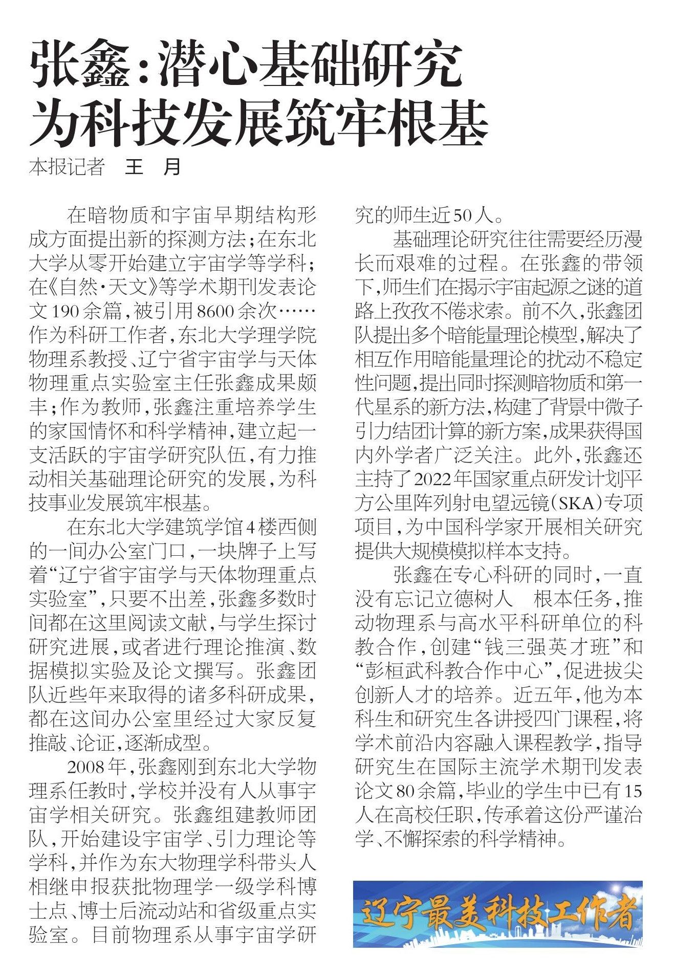 在暗物质和宇宙早期结构形成方面提出新的探测方法;在东北大学从零开始建立宇宙学等学科;在《自然·天文》等学术期刊发表论文190余篇,被引用8600余次……作为科研工作者,东北大学理学院物理系教授、辽宁省宇宙学与天体物理重点实验室主任张鑫成果颇丰;作为教师,张鑫注重培养学生的家国情怀和科学精神,建立起一支活跃的宇宙学研究队伍,有力推动相关基础理论研究的发展,为科技事业发展筑牢根基。