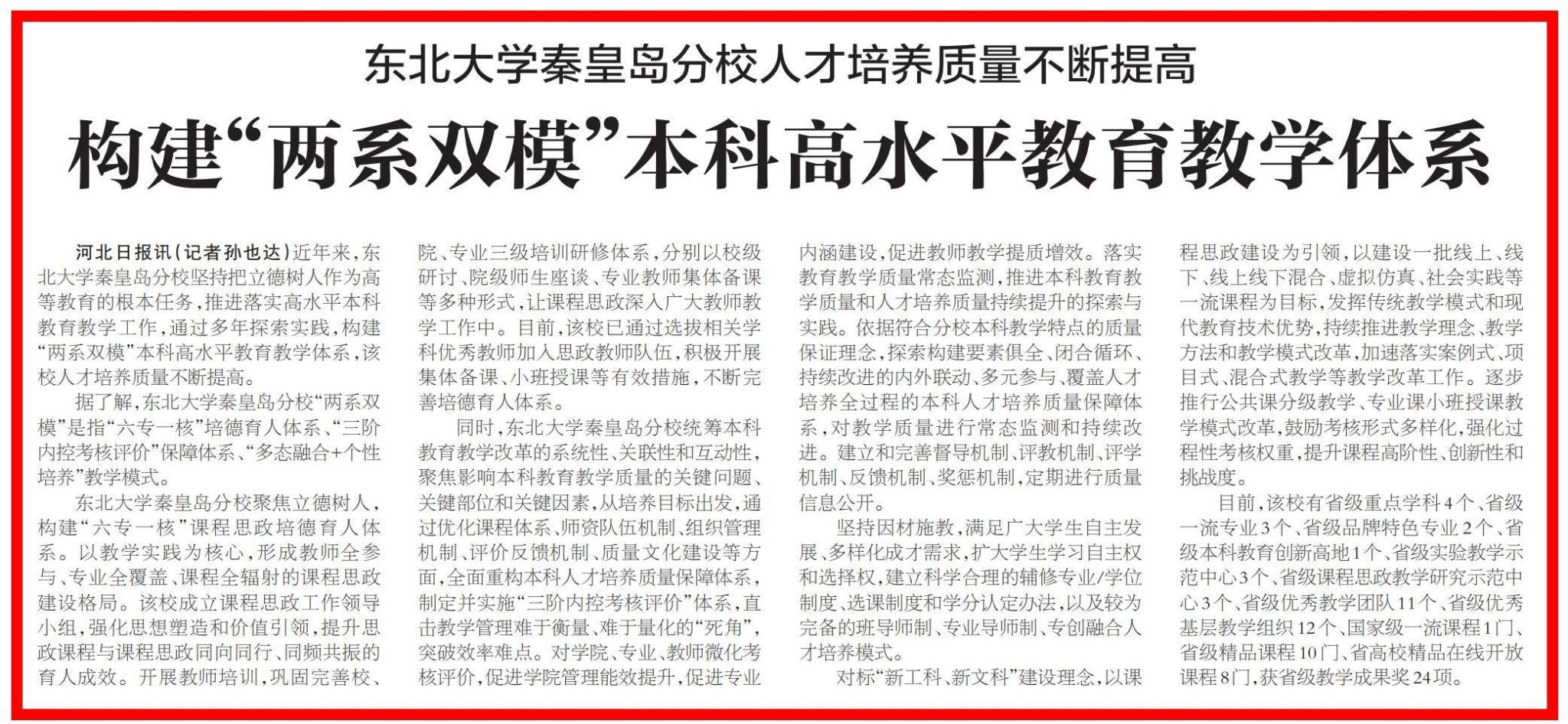 据了解,东北大学秦皇岛分校“两系双模”是指“六专一核”培德育人体系、“三阶内控考核评价”保障体系、“多态融合+个性培养”教学模式。