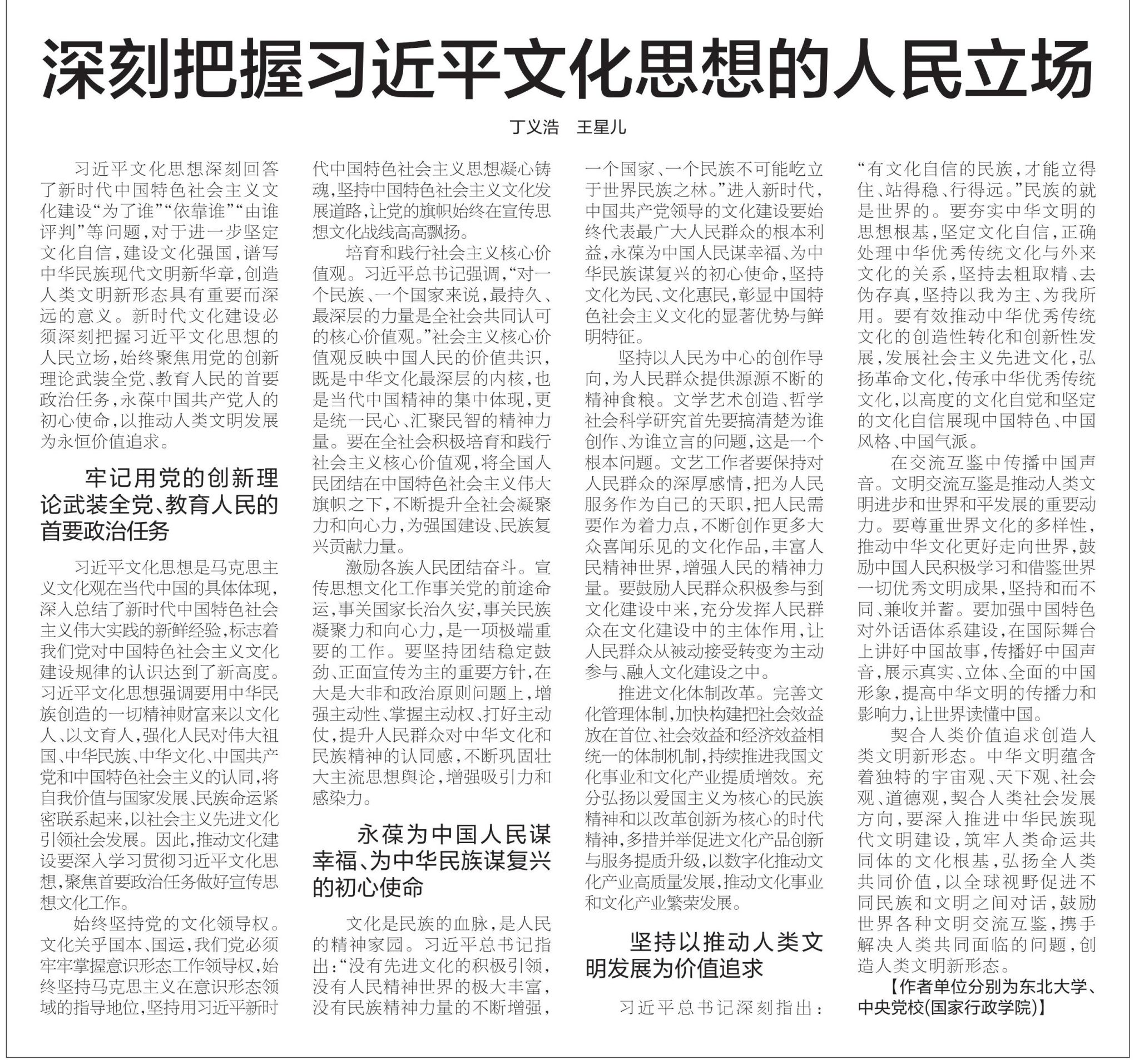 习近平文化思想深刻回答了新时代中国特色社会主义文化建设“为了谁”“依靠谁”“由谁评判”等问题,对于进一步坚定文化自信,建设文化强国,谱写中华民族现代文明新华章,创造人类文明新形态具有重要而深远的意义。新时代文化建设必须深刻把握习近平文化思想的人民立场,始终聚焦用党的创新理论武装全党、教育人民的首要政治任务,永葆中国共产党人的初心使命,以推动人类文明发展为永恒价值追求。