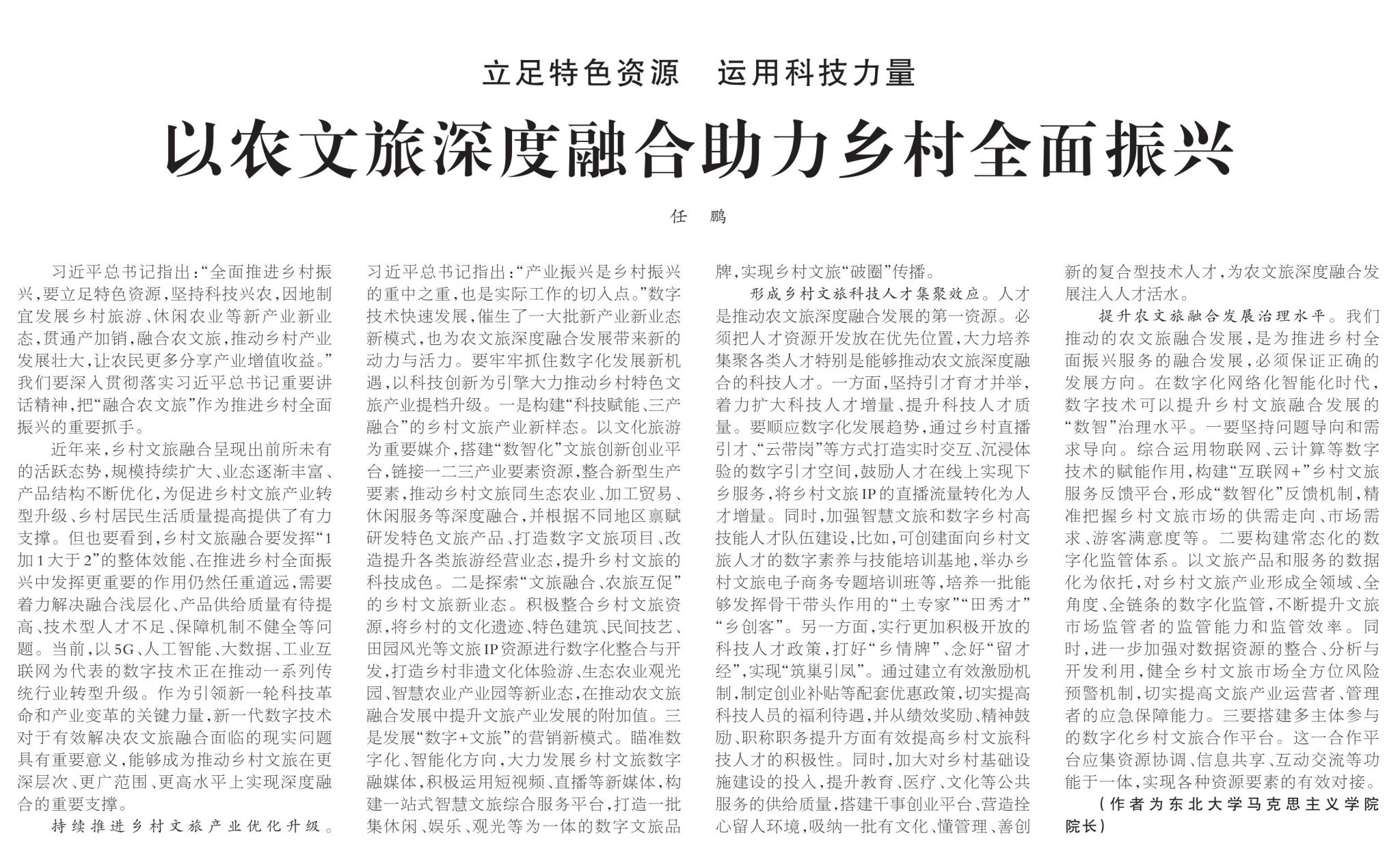 习近平总书记指出:“全面推进乡村振兴,要立足特色资源,坚持科技兴农,因地制宜发展乡村旅游、休闲农业等新产业新业态,贯通产加销,融合农文旅,推动乡村产业发展壮大,让农民更多分享产业增值收益。”我们要深入贯彻落实习近平总书记重要讲话精神,把“融合农文旅”作为推进乡村全面振兴的重要抓手。
