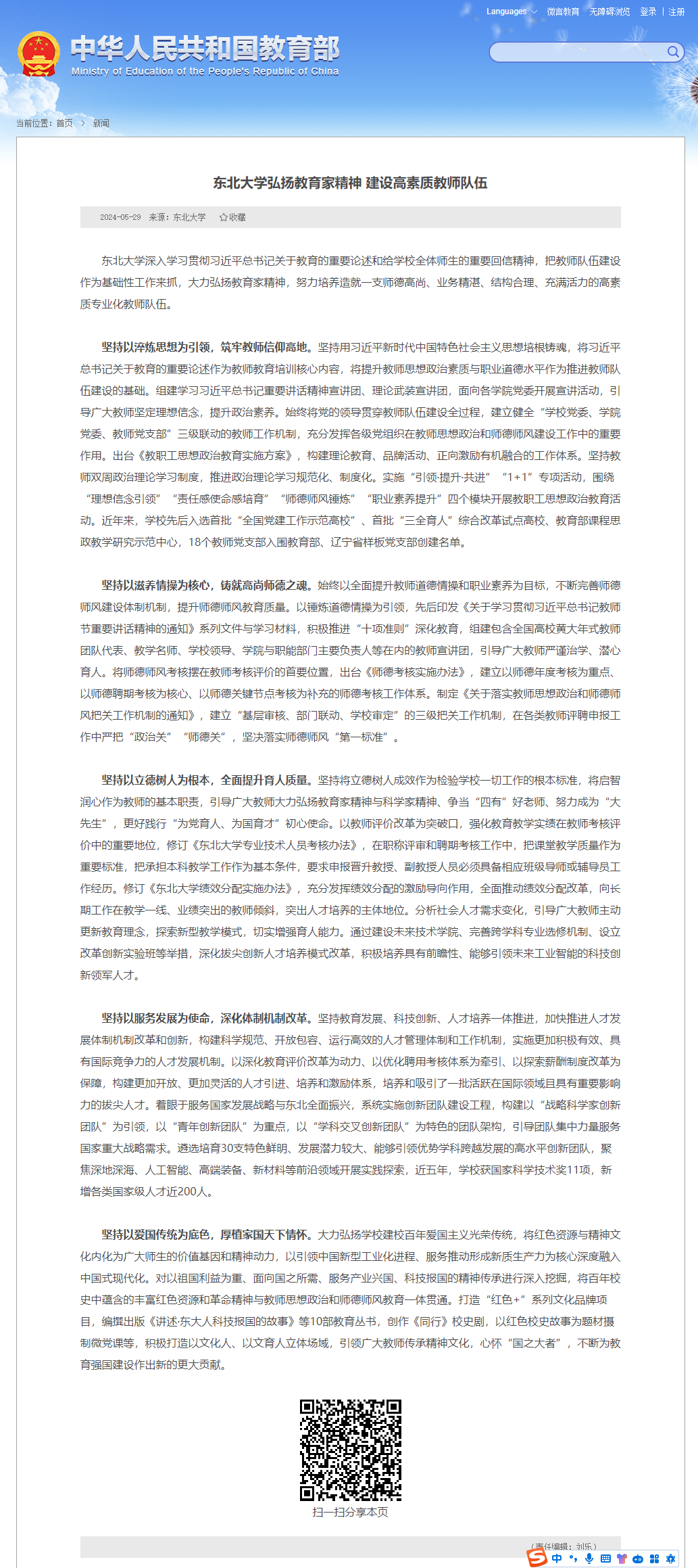 东北大学深入学习贯彻习近平总书记关于教育的重要论述和给学校全体师生的重要回信精神,把教师队伍建设作为基础性工作来抓,大力弘扬教育家精神,努力培养造就一支师德高尚、业务精湛、结构合理、充满活力的高素质专业化教师队伍。