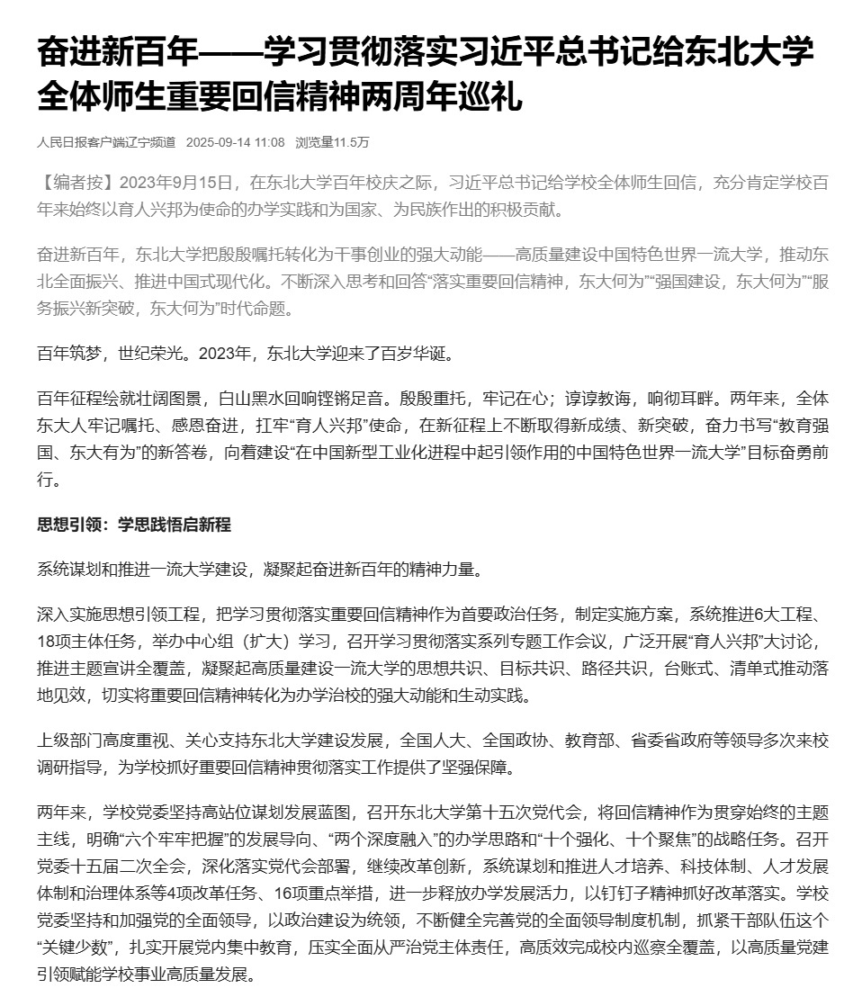 【编者按】2023年9月15日,在东北大学百年校庆之际,习近平总书记给学校全体师生回信,充分肯定学校百年来始终以育人兴邦为使命的办学实践和为国家、为民族作出的积极贡献。