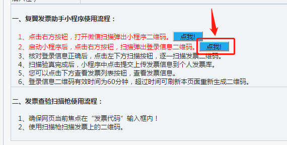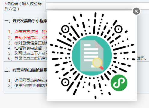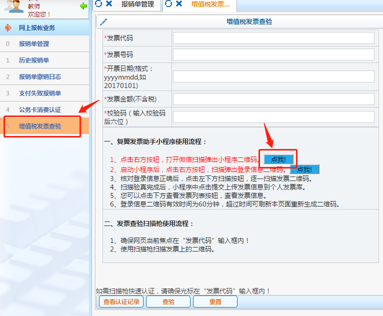 登录“高级财务管理平台”的“投递报销”模块,点击“增值税发票查验”,点击第一个“点我”按钮(蓝色图标),打开微信“扫一扫”,扫描弹出小程序二维码。