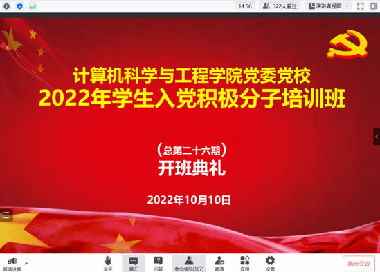 10月10日晚,计算机科学与工程学院在线上举行学院党委党校2022年学生入党积极分子培训班开班典礼(总第26期)。东北大学党校常务副校长、机关党委书记(兼)、党委组织部副部长(兼)初青松,计算机学院党委书记邸馗,党委副书记、副院长(兼)聂国东,学生工作办公室相关老师和300余名入党积极分子参加开班典礼。