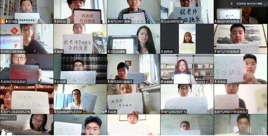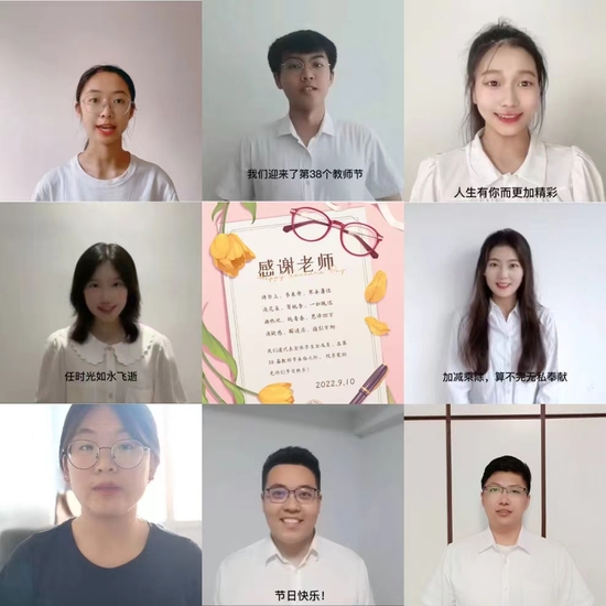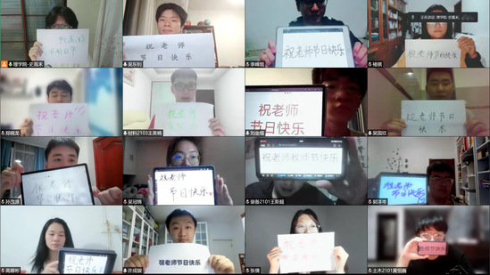 在“吾敬吾师,笔墨颂恩情”活动中,广大学子通过撰写书信、制作贺卡等方式,将真挚的感恩之情向老师传递,让远隔千里的师生心心相牵;在“吾念吾师,千里心相牵”活动中,各学院、班级精心策划,在课前利用线上平台隔空“比心”,发起了“列队式”节日祝福,让线上教学课堂温情四溢;在“吾爱吾师,佳节寄祝福”中,东北大学学生会等各级学生组织通过录制视频感谢老师的辛勤工作,为全体教师送上暖暖的“双节”祝福。