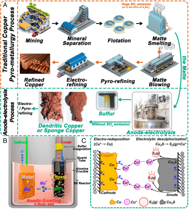 图1.a. 传统硫化物冶炼及阳极电解流程示意图,b. 阳极电解装置示意图,c. 阳极电解原理示意图。