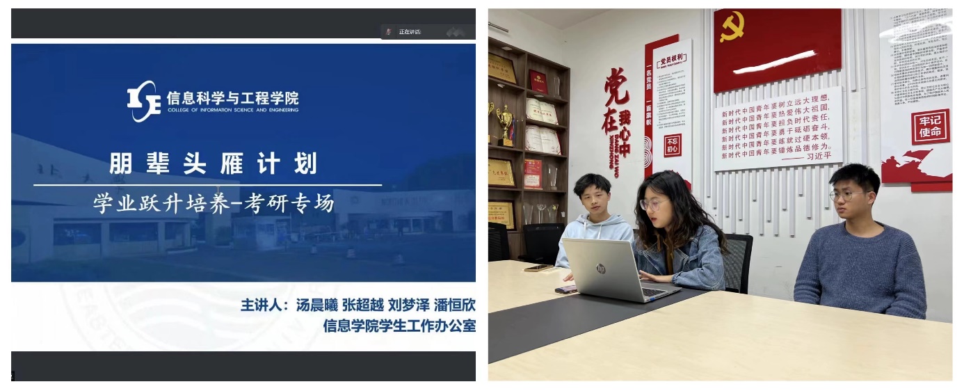 深耕助研行动,力保考研群体有去向。学院在2018级本科生初次毕业去向摸底了解到,78.39%的学生有考研意愿,针对此群体,学院整合育人资源,建立了“辅导员-班导师-学生骨干”帮扶结构。由辅导员摸排建立考研学生信息台账,全覆盖谈心谈话制定“一生一策”。学生考研准备中,邀请班导师发挥专业优势,与学生一起规划专业复习进度;动员往届成功学生,以互助群、线下座谈等方式,提供考研准备资料、经验分享;在考研准备中后期,学院提供周到的慰问服务,从精神上为考研学生提供了坚强后盾。在考研调剂时期,学院建立“调剂群”,辅导员与班导师以“一盯一”模式,从专业学习、高校招生角度提供调剂意见。对于考研失利计划再考的学生,辅导员偕同班级干部分析其失利原因,提供往年考研数据和案例,帮助学生及家长再次明确学生毕业方向,摆正就业态度;成立学生党员就业服务小组,汇总契合学生需求的就业信息,实现就业信息精准传达。“我非常庆幸考研初期的时候有辅导员与班导师一再帮我分析自身情况,帮我制定适合自己的考研规划,我的成功离不开学院老师的辛苦付出。”考研初试413分、成功考取我校控制工程方向的董津霆感慨。截至目前,信息学院整体升学率达到56.90%。