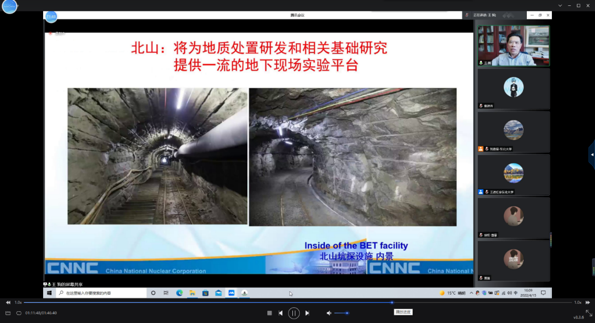 王驹研究员以“高放废物地质处置关键科学问题及北山地下实验室进展”为题作了精彩的线上学术报告。报告重点介绍了高放废物地质处置关键科学问题,北山地下实验室的定位和功能,选址、场址评价、工程设计中的若干关键技术问题,现场试验规划以及团队扎根戈壁的感人故事。