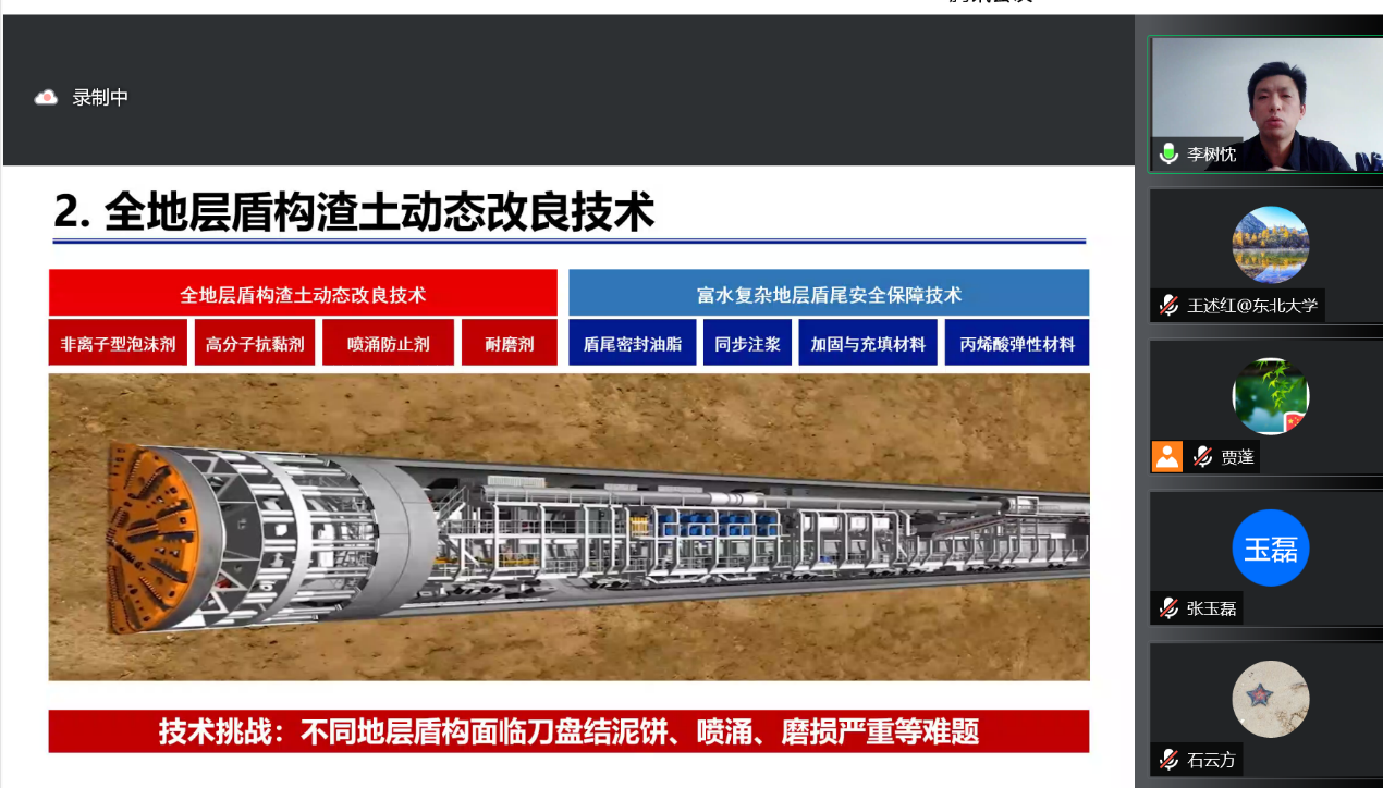 李树忱博士应邀做客“百年东大·红砖讲堂”,以“城市轨道交通盾构高效掘进关键科学问题与研究进展”为题作线上学术报告。报告重点介绍了盾构发展与施工面临的科学问题、全地层盾构渣土动态改良技术、富水复杂地层盾尾安全保障技术。