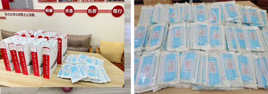 3月27日、4月5日,学院先后以走访寝室和统一领取相结合的方式向在校学生发放两批防疫物资,累计派发口罩近7000个,医用温度计50余支。