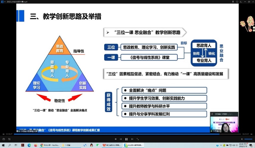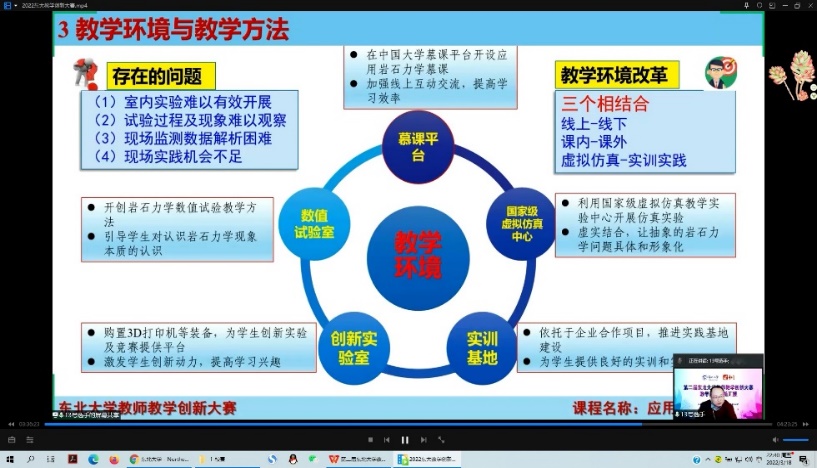 本次教学设计创新汇报按照疫情防控要求采取腾讯会议+超星直播形式进行并全程直播。16支参赛队伍围绕课程概述、教学设计、教学环境与方法、创新特色、教学效果等分别从课程思政设置、教材选用、学情痛点分析、教学体系改革等方面,全方位展示了东北大学一线教师深耕教育教学改革的最新成果,突出展示了我校教师在重构知识体系和内容、创新教考模式和方法、深化课程思政体系与成效、助推课程持续改进等方面取得的最新成绩。比赛吸引了近3000人在线观看。