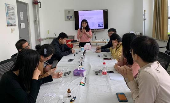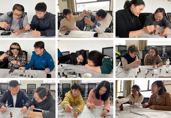 活动现场,老师们保持平时做学问的严谨作风,拿着量杯、滴管仔细地计算各种试剂的用量,认真制作自己的专属作品,尽情体验手工制作的喜悦。