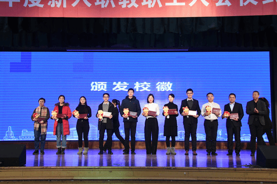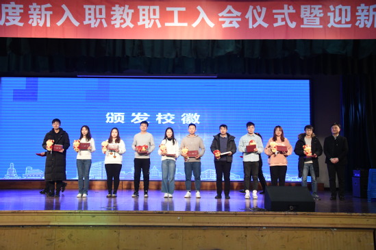 入会仪式上,与会嘉宾为新入职教职工依次颁发校徽。