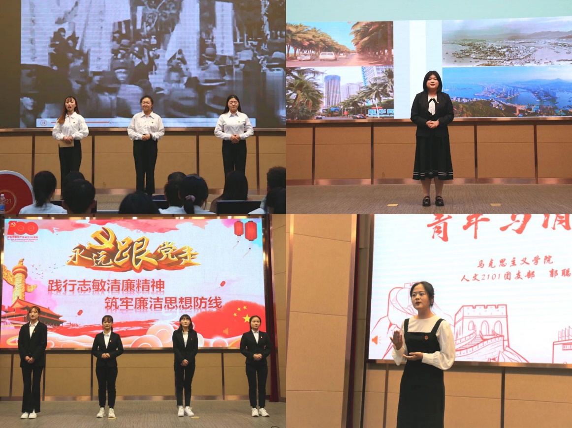 主题宣讲比赛共分为“清风作伴好扬帆:党风廉政,正气清风”“砥砺百年正风华:百年征程,史诗恢弘”“纸上得来终觉浅:大道至简,实干为要”“直挂云帆济沧海:心中有榜样,脚下有力量”四个主题。经过初赛和复赛,每个主题各两支队伍,共八支队伍参与现场竞演。各支参赛队伍准备充分,发挥出色,诵读内容主题深刻,竞演氛围热烈,博得与会师生阵阵掌声。