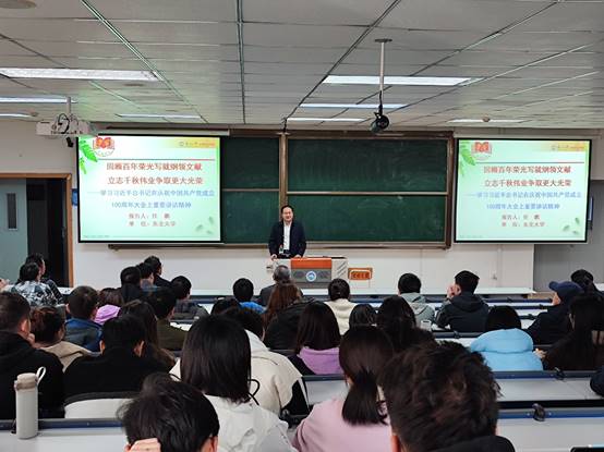10月20日下午,资源与土木工程学院在采矿学馆201室开展党委理论学习中心组(扩大)学习暨党史学习教育专题报告会。东北大学马克思主义学院副院长任鹏教授应邀为学院师生作了题为“回顾百年荣光写就纲领文献,立志千秋伟业争取更大光荣——学习习近平总书记在庆祝中国共产党成立100周年大会上的重要讲话精神”的专题报告。学院班子成员、师生共计200余人参加报告会。