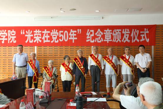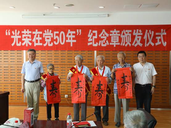 杨东坪、刘承军为老党员们颁发“光荣在党50年”纪念章,并向今年恰逢80、90寿辰的4位老师赠送刘秀儒老师的 “寿”字书法作品,并送上学院及全体师生对老师们健康长寿的深切祝福。
