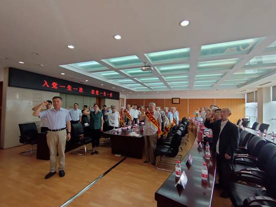 会议最后,由杨东坪领誓,与会的老党员们集体重温入党誓词。入党一生一次、在党一生一世。老党员们身披红色绶带,佩戴“光荣在党50年”纪念章,在重温入党誓词时声音依旧铿锵有力。