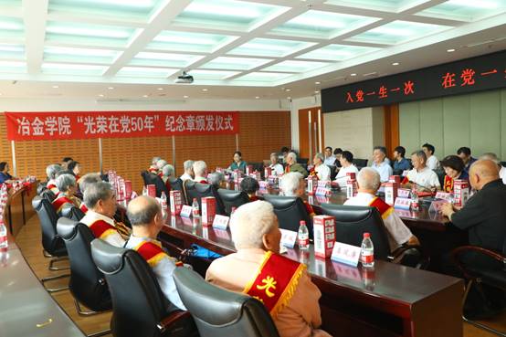 6月29日,冶金学院在汉卿会堂308室举行“光荣在党50年”纪念章颁发仪式。学院院长刘承军、党委书记杨东坪及全体领导班子成员,工会主席、系主任等教师代表,离退休冶金分会的负责老师出席仪式。25名获得“光荣在党50年”纪念章的老党员代表和80岁、90岁高龄的老同志们参加仪式。仪式由副院长王梅主持。