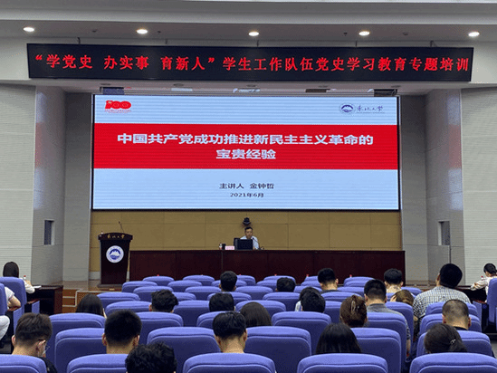 6月10日下午,东北大学“一五一十”思政文化育人一体化平台之“学党史 办实事 育新人”学生工作队伍党史学习教育专题培训首场报告会在主楼822室举办。东北大学马克思主义学院副教授金钟哲担任主讲人,作了题为“中国共产党成功推进新民主主义革命的宝贵经验”的专题报告,全校学生工作干部参加会议。
