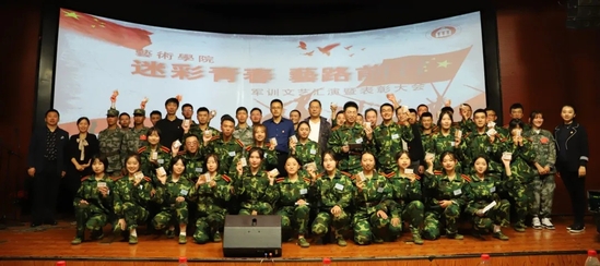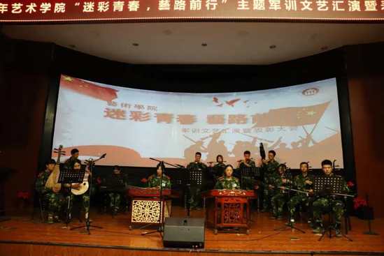 表彰大会结束后,“迷彩青春,藝路前行”军训文艺汇演在器乐合奏《花好月圆》中拉开序幕。学生们用歌声、用琴声、用画笔表达对即将开启的大学生活的向往。其中,原创歌曲《陪伴》表达了医生对患者陪伴、父母对孩子的陪伴,老师对学生陪伴;小合唱《七律长征》致敬革命先烈;设计专业新生以笔传情,为教官送上亲笔绘制的画像。最后,晚会在《我爱你中国》全场大合唱中落下帷幕,以此向即将到来的祖国生日献礼。