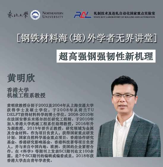 为进一步推动我国先进高强钢基础研究及技术创新发展,拓宽高校师生及科研机构国际视野,近日,东北大学轧制技术及连轧自动化国家重点实验室推出“钢铁材料海(境)外学者无界讲堂”,邀请海(境)外学者采用在线讲座的方式进行授课。5月19日,首期特邀香港大学机械工程系黄明欣教授作 “超高强钢强韧性新机理”报告,通过“腾讯会议”和直播形式同时进行,1600余人在线参与。