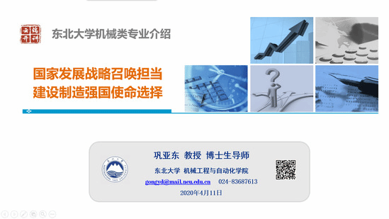 4月11日,东北大学“云端开讲”机械类专场在线上举办,机械学院博士生导师巩亚东教授作为“教授为专业代言”的主讲人,为数万名考生及家长介绍了机械类专业总体情况。