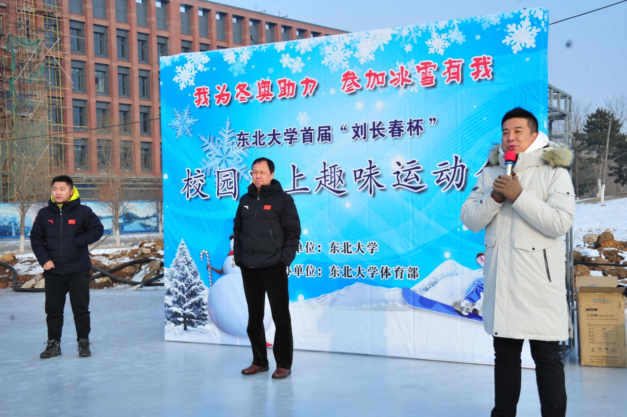 12月25日下午,“我为冬奥助力,参加冰雪有我”东北大学首届“刘长春杯”校园冰上趣味运动会在浑南校区滑冰场开幕,体育部主任陈松、副主任孙玉宁出席开幕式。