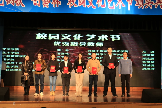 颁奖典礼上,《云乐改歌家》等7个节目获“才藝奖”,胡永欣等13人获得校园文化艺术节“优秀指导教师”称号,刘鹏霖等18人获得校园文化艺术节“优秀组织工作者”称号,计算机科学与工程学院等12个学院获得校园文化艺术节“优秀组织单位”。与会嘉宾为校园文化艺术节各项获奖者颁发证书。