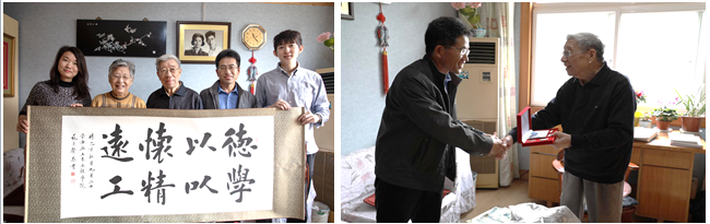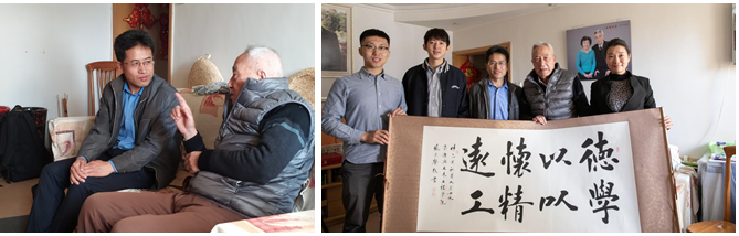 艾国生围绕“五四煤”班产生时的国家及行业背景、当年班级同学的学习生活状况、“五四煤”精神内涵等几个方面与钱鸣高院士和王端庆校长进行了交谈。拜访结束后,艾国生郑重地为老先生们送上学校校徽纪念章和带有“德以怀远,学以精工”院训的书法卷轴。