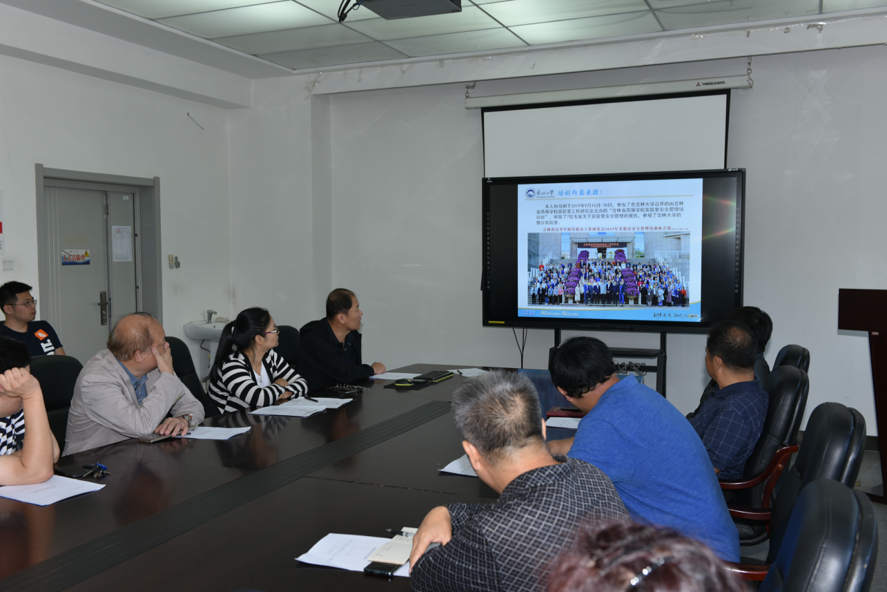 最后,实验中心韩学军、马俐向与会人员传达了9月16—18日,在吉林大学参加的“高校实验室安全管理培训”相关安全管理教育培训知识。韩学军依据培训的具体内容,结合学院实验室管理现状,就学院“气瓶”、“化学品”等特殊设备、特殊药品的存放、管理等事项进行了详尽的介绍和建议,让大家对实验室安全管理工作重要性的认识有了进一步提升。