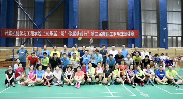 7月6日,计算机科学与工程学院在南湖校区羽乒馆举行“70华诞‘羽’你逐梦前行”第三届教职工羽毛球团体赛。学院50余名教职工参加本次活动,校工会副主席沈晓波出席开幕式。