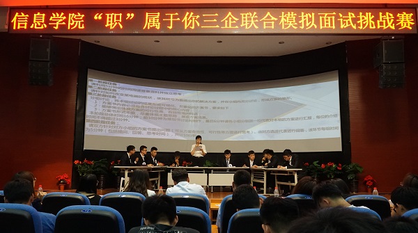 6月12日,信息科学与工程学院在科学馆201室举办首届企业联合模拟面试——“职”属于你三企面试挑战赛。海尔集团东北区域高级人力资源总监李君实、人力资源经理夏良帅,新松机器人高级招聘经理胡博、大学合作经理陈舒柳,杭州海康威视数字股份有限公司沈阳分公司人力资源负责人孙萍,东北大学职业发展指导中心、信息学院相关工作人员及学院300余名本科生、研究生参加活动。