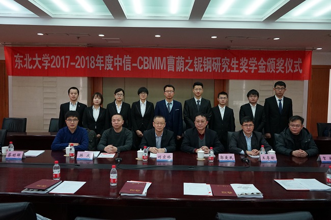 1月10日上午,东北大学2017-2018学年中信-CBMM曹荫之铌钢研究生奖学金颁奖仪式在汉卿会堂308室举行。中信金属股份有限公司总工程师郭爱民、高级经理王厚昕,东北大学研究生院副院长兼党委研究生工作部部长刘宏林,材料科学与工程学院、冶金学院相关负责人出席颁奖仪式。潘海军等9名研究生获得中信-CBMM曹荫之铌钢研究生奖学金。颁奖仪式后,与会专家、获奖研究生代表作了相关报告并深入交流。