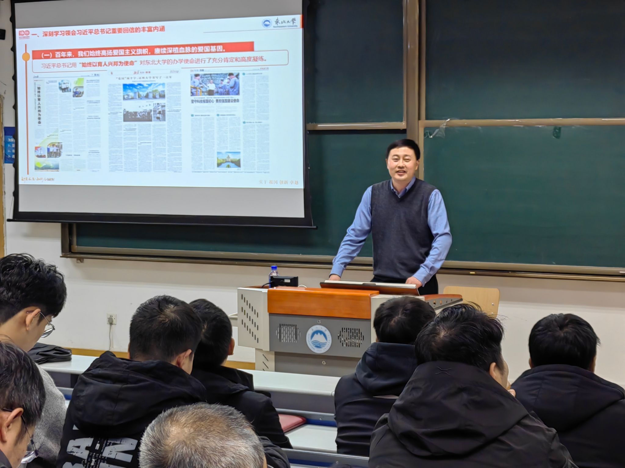 闫研从“深刻认识习近平总书记重要回信的丰富内涵”“全面把握重要回信精神的实践要求”“弘扬爱国主义光荣传统 为党育人为国育才”等三个方面展开,用丰富的事例和生动的语言,讲述了东北大学的爱国主义传统和家国情怀,以及心怀科技报国的崇高理想、矢志培育英才的光荣传统。闫研从学校实际出发,逐句解读习近平总书记给东北大学全体师生重要回信,从学校发展的“坐标方位”“行动纲领”“精神传承”“根本任务”“动力源泉”“攻坚重点”“使命追求”等七个方面讲解了学校贯彻落实习近平总书记重要回信精神的实践要求和重点举措。