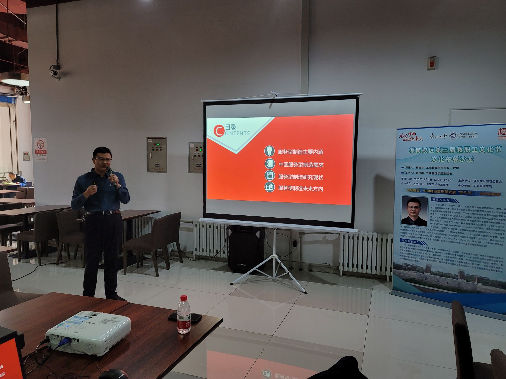 10月26日中午,由浑南校区管理委员会主办,工商管理学院承办的“活力浑南献礼百年东大”浑南校区第三届教职工文化节之文化午餐沙龙在浑南校区教工餐厅举行。工商管理学院院长蒋忠中教授以“中国制造高质量发展‘新引擎’:服务型制造”为题作专题讲座。